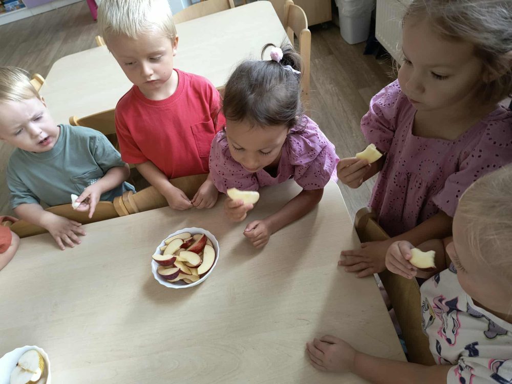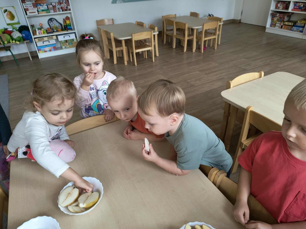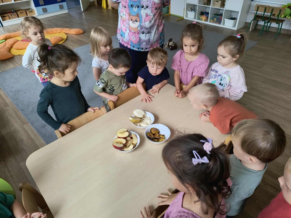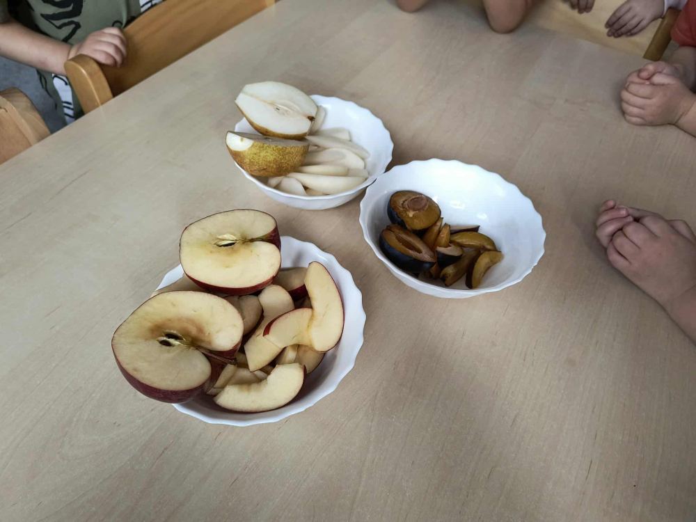 Jesienią smakujemy bogactwo sezonowych owoców, takich jak jabłka, gruszki, śliwki, które doskonale nadają się na przetwory, do ciast, deserów, a także dań wytrawnych. Wykorzystanie tych darów jesieni to doskonały sposób na wzmocnienie odporności i wzbogacenie diety o naturalne witaminy. O tym przekonały się najmłodsze dzieciaki rozkoszując się smakami tychże owoców.