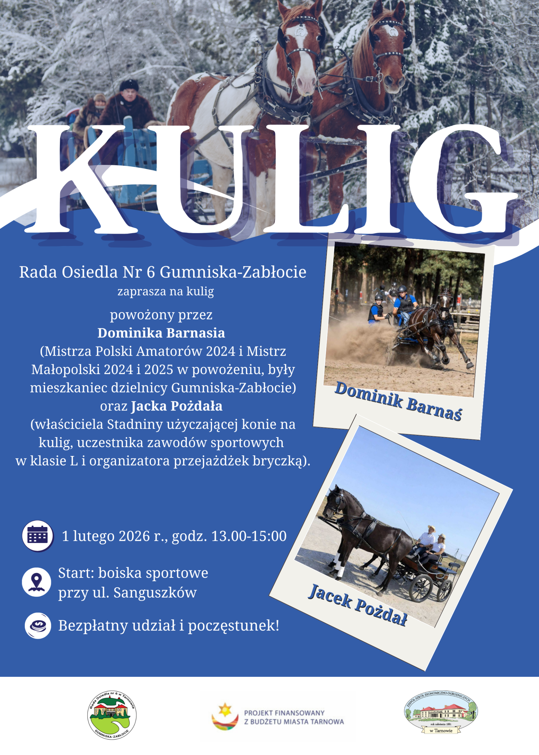 Kuligiem powoził będzie Dominik Barnaś – Mistrz Małopolski 2024 i 2025 oraz Mistrz Polski Amatorów 2024 w powożeniu, w przeszłości mieszkaniec dzielnicy Gumniska. W zaprzęgu wykorzystane zostaną konie ze Stajni Jacka Pożdała – uczestnika zawodów sportowych w klasie L oraz organizatora przejażdżek bryczką po malowniczych okolicach w okresie letnim oraz kuligów w okresie zimowym (Podlesie 34A, 39-216 Podlesie, tel. +48661277021).