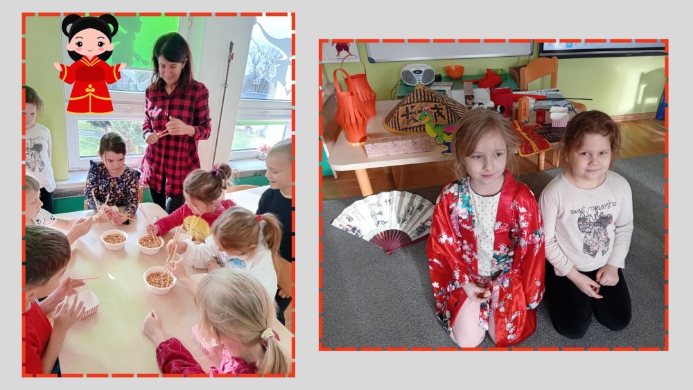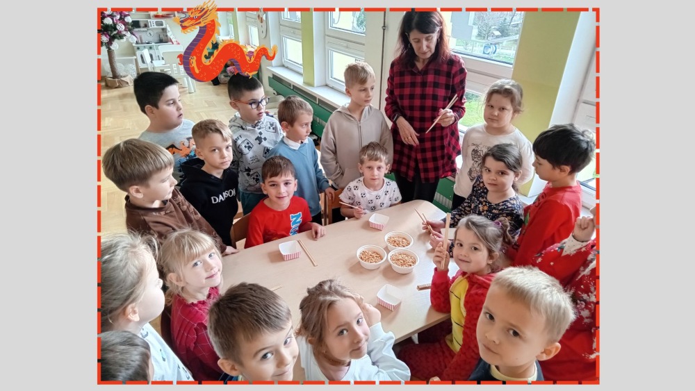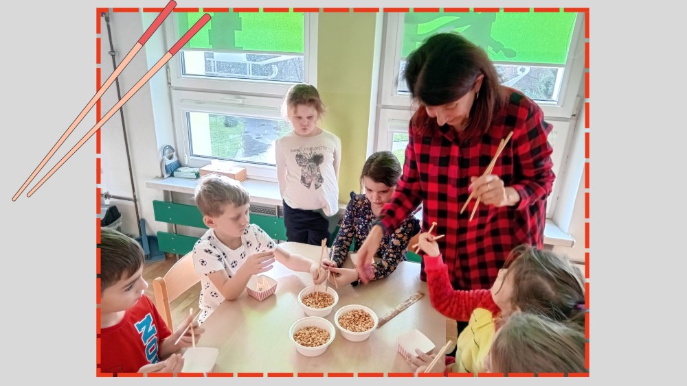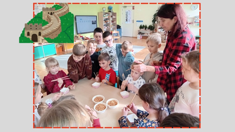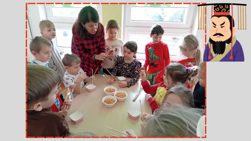 Dzieci z grupy Pszczółek odkrywały kulturę, tradycje i ciekawostki o fascynującym kraju, jaki są Chiny. Najwięcej radości wywołała nauka jedzenia chrupek pałeczkami, a także oglądanie prawdziwych chińskich monet i banknotów.