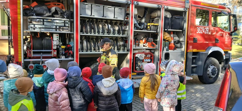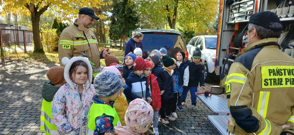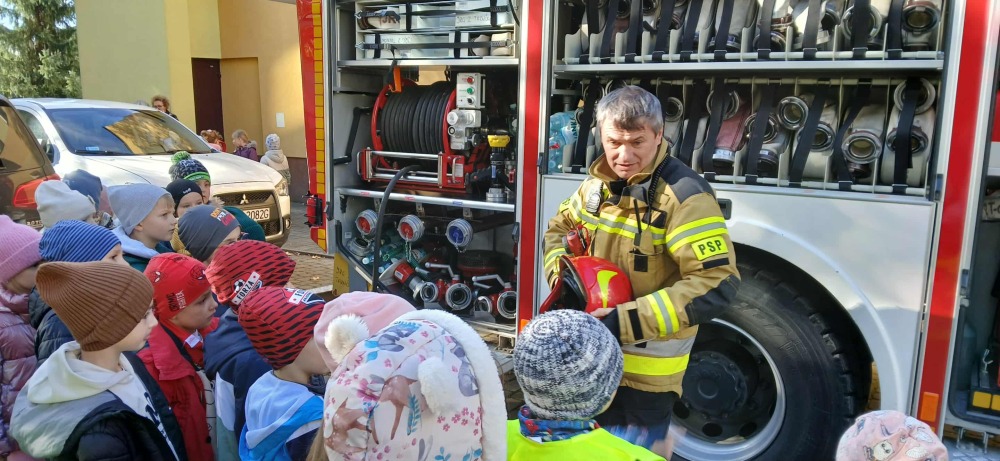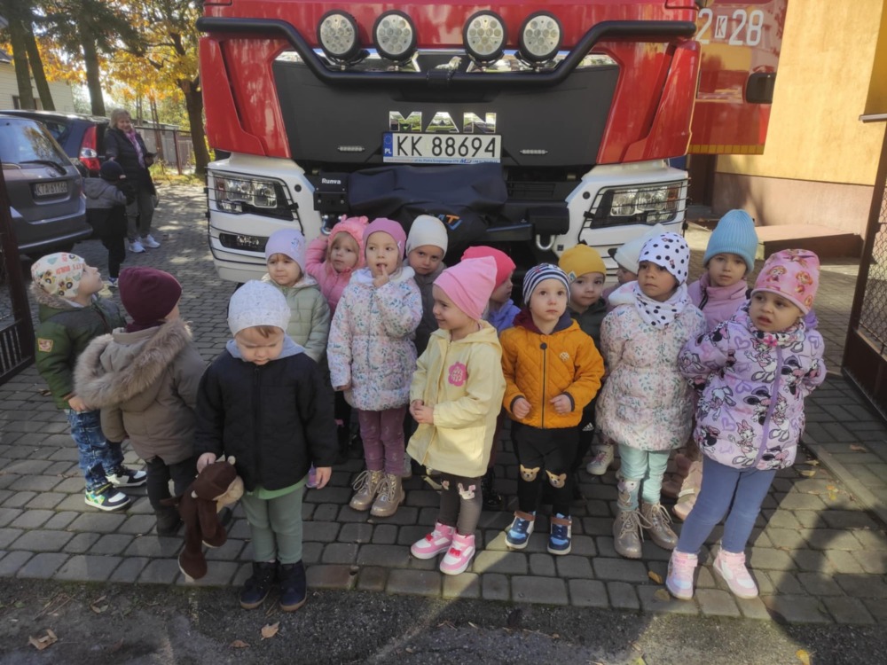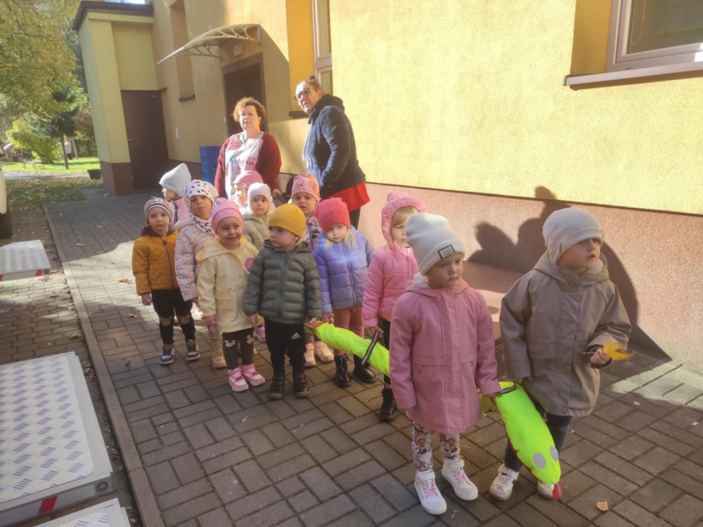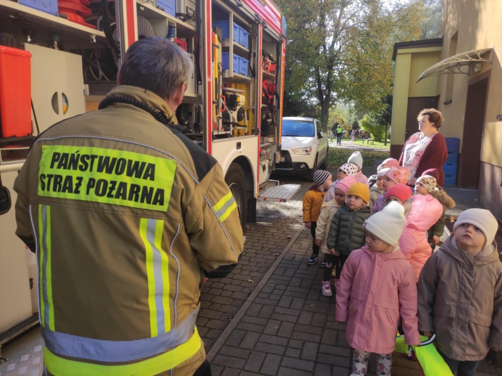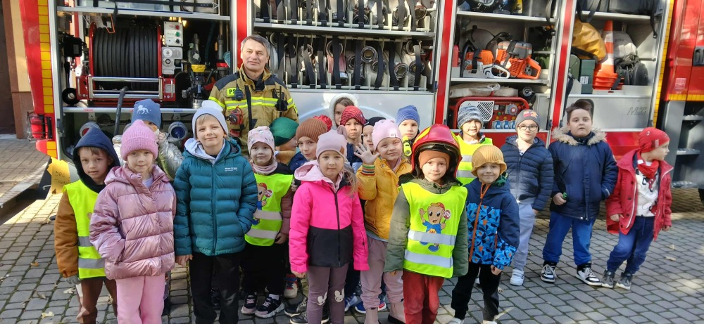 Dnia 21.10.2025 r. w naszym przedszkolu miała miejsce próbna ewakuacja przeciwpożarowa. Celem akcji było nabywanie przez dzieci umiejętności właściwych zachowań w sytuacji zagrożenia, zapoznanie ich z zasadami bezpiecznej ewakuacji – szybkiej, zorganizowanej i pozbawionej elementów paniki. Zapoznanie personelu i dzieci z praktycznym prowadzeniem ewakuacji osób przebywających w budynku. Zakres i przebieg działań został uzgodniony z Państwową Strażą Pożarną w Tarnowie. Ta też jednostka przyjechała do naszego przedszkola, aby obserwować jak uczestnicy ewakuacji na sygnał alarmowy opuścili budynek wyznaczonymi wyjściami ewakuacyjnymi. Cała akcja przebiegała sprawnie i bez zakłóceń. Na kilka minut wszystkie sale przedszkolne i pomieszczenia administracyjno – gospodarcze pozostały puste. Wszystkie dzieci bardzo sprawnie, bezpiecznie i szybko opuściły budynek. Przed budynkiem przedszkola czekała na dzieci miła niespodzianka – samochód ratowniczy Straży Pożarnej, który wzbudził ogromny zachwyt.