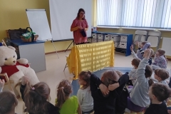 Krasnale i Pszczółki uczestniczyły w zajęciach czytelniczych w filii nr 1 Miejskiej Biblioteki Publicznej na Gumniskach. Dzieci wysłuchały w skupieniu baśni braci Grimm „Czterej Muzykanci z Bremy” czytanej przez Panią bibliotekarkę. Później inscenizowały jej treść w teatrzyku kukiełkowym. Zabawiły się również w muzykantów z Bremy – śpiewały znany kanon „Panie Janie” ale po zwierzęcemu. Było wesoło i bardzo miau, hau, ko-ko a nawet i-haa! A dodatkowo nauczyły się powitania i pożegnania w języku japońskim. To były super zajęcia.